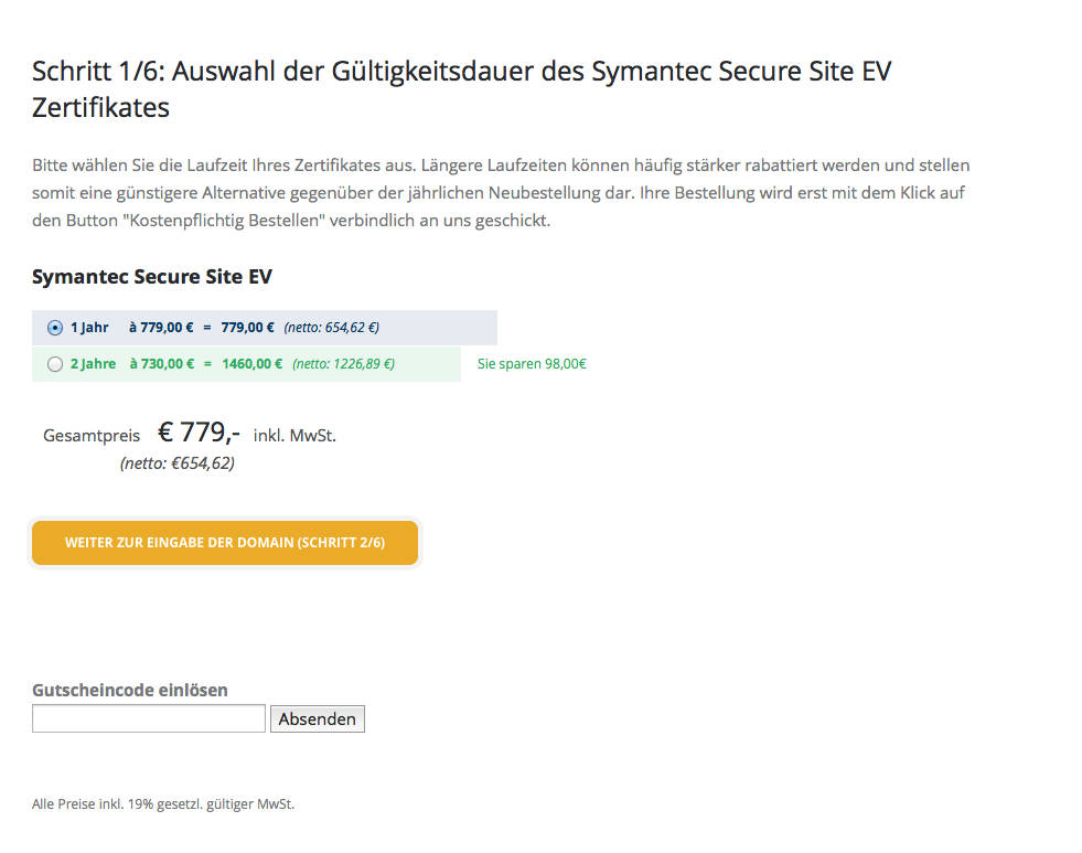 Klicken Sie bei dem Zertifikat Ihrer Wahl auf den Button ‚ÄúBestellen‚Äú. Im ersten Schritt können Sie die gewünschte Laufzeit Ihres Zertifikats auswählen. Je nach Produkt kann diese 1 bis 4 Jahre betragen. Bei den meisten Zertifikaten erhalten Sie Rabatte wenn Sie sich für eine längere Laufzeit entscheiden.
