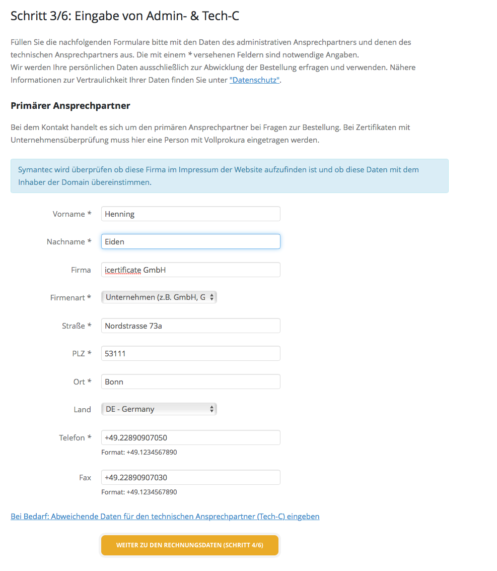 Geben Sie im dritten Schritt die Kontaktdaten des administrativen (Admin-C) und des technischen Ansprechpartners (Tech-C) an. Wenn Sie ein Zertifikat mit Unternehmensvalidierung bestellen, werden diese Daten von der Zertifizierungsstelle durch Einfordern schriftlicher Nachweise (z.B. Handelsregisterauszug) verifiziert. Bei Zertifikaten mit erweiterter Validierung wird ein geschäftsführender Kontakt benötigt.