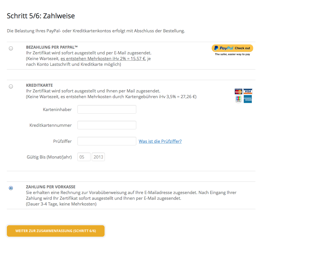 Im fünften Schritt können Sie eine Zahlungsart auswählen. Auch Zahlungen mittels PayPal sind möglich.