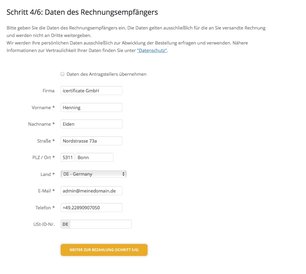 In diesem Schritt werden die Daten des Rechnungsempfängers benötigt. Firmen können hier die Rechnungsdaten entsprechend ihren Bedürfnissen eingeben.