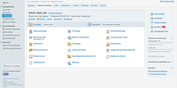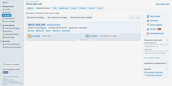 - Klicken Sie auf den Domain-Namen, hier im Beispiel tetris-test.net