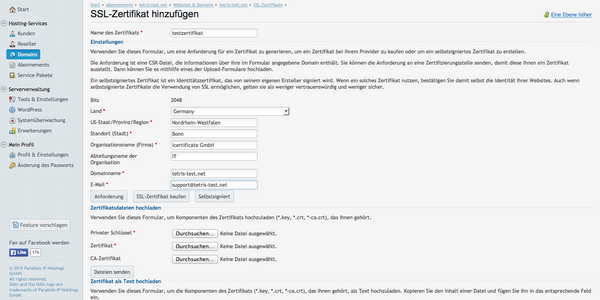 Auf dieser Seite wird erklärt, wie Sie eine Zertifikatsregristrierungsanforderung (Certificate Signing Request - CSR) bei Plesk 12 erstellen können. Im CSR wird ihr öffentlicher Schlüssel (Public Key - PK) angegeben sowie weitere Informationen für das jeweilige Zertifikat, insbesondere der zu verwendene Domain-Name als Common Name (CN) sowie die Kontaktdaten des Antragstellers. Mit diesen Daten aus dem CSR kann Ihnen nach Prüfung und Genehmigung die Zertifizierungsstelle (Certificate Authority - CA) das Zertifikat ausstellen.