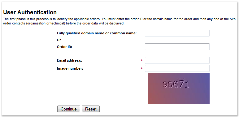 Um den Neuausstellungsprozess zu starten und auf die unten abgebildete Seite weitergeleitet zu werden, klicken Sie bitte auf den folgenden Link: https://products.geotrust.com/orders/orderinformation/authentication.do