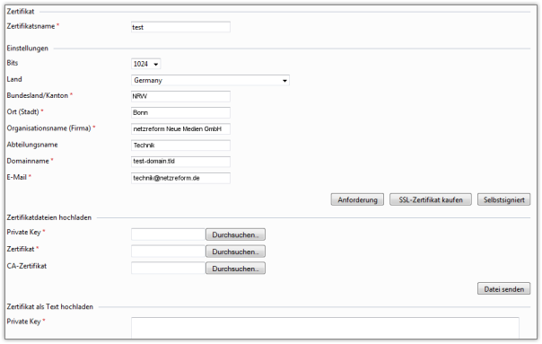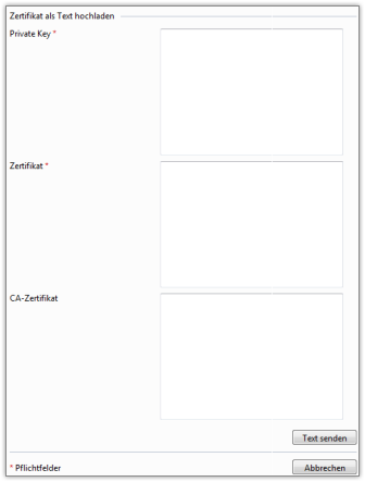 Die zweite Möglichkeit wäre, dass Sie die Zertifikatsdaten als Text auf den Server laden, kopieren Sie in diesem Fall die entsprechenden Textblöcke in die korrespondierenden Felder (Schlüssel ‚Üí Private Key, Zertifikat ‚Üí Zertifikat). Auch hier können Sie eventuell notwendige Zwischenzertifikate installieren.