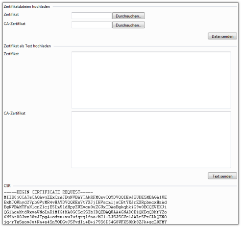 in das Feld "Zertifikat" im Abschnitt "Zertifikat als Text hochladen". Gegebenenfalls ist es notwendig, dass Sie ein zwischengeschaltetes Zertifikat der Zertifizierungsstelle installieren müssen, kopieren Sie in diesem Fall den Textblock für das sogenannte "Intermediate Certificate" in das Feld "CA-Zertifikat".