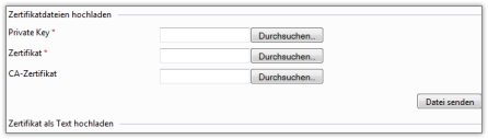 Wahlweise kann dies per Copy'n'Paste oder per Datei-Upload erfolgen. Durchsuchen Sie im Falle der Installation mittels Dateiupload den Ordner auf Ihrem Rechner, der die Daten enthält und wählen Sie hier die Dateien für Schlüssel und Zertifikat in den entsprechenden Feldern aus. Sollte ein Intermediate-Zertifikat benötigt werden, können Sie die Datei entsprechend in das Feld "CA-Zertifikat" setzen.