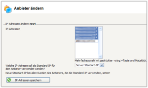 Sollten Sie keine exklusiv nutzbare IP Adresse mehr zur Verfügung haben, müssen Sie eine bei Ihrem Anbieter beantragen. Haben Sie selbst aber administrativen Zugriff auf Ihren Server, so können Sie dem Reseller Account eine IP Adresse zu ordnen. Öffnen Sie dazu als Administrator den Account des betreffenden Resellers (Menü Anbieter -> Anbieter ändern -> IP-Adressen ändern).
